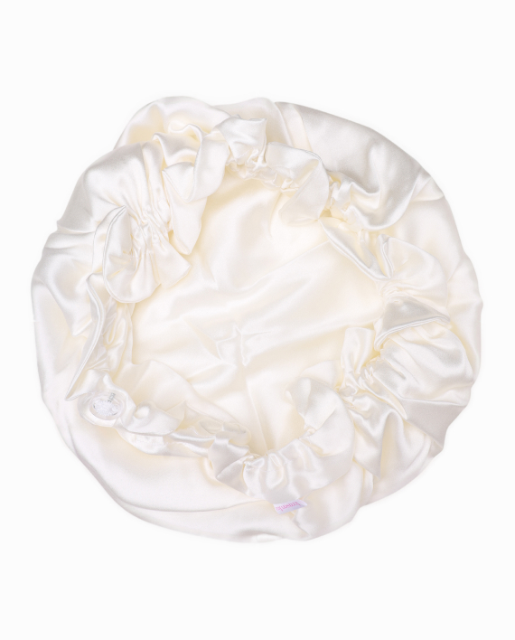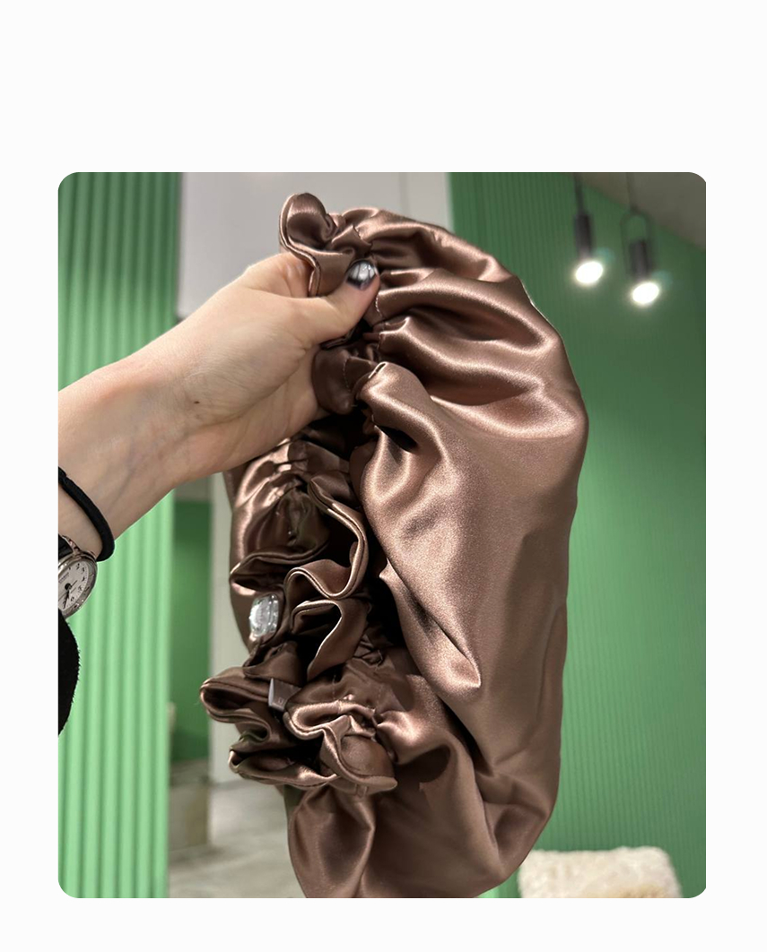 Шапочка зроблена із 100% шовку, тож не паритиме голову влітку. Є м’якою на дотик та регулюється спеціальною утяжкою.Також у комплекті наявний рожевий мішечок для зберігання.
