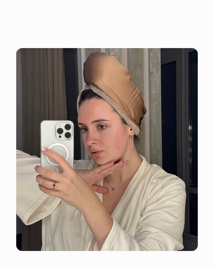 ✨ Улюблений лайфгак майстринь: нанесли маску, одноразову шапочку для душу, закрутили тюрбан махровою стороною всередину — і гріємо феном. Завитки скажуть «дякую за глибоке зволоження».