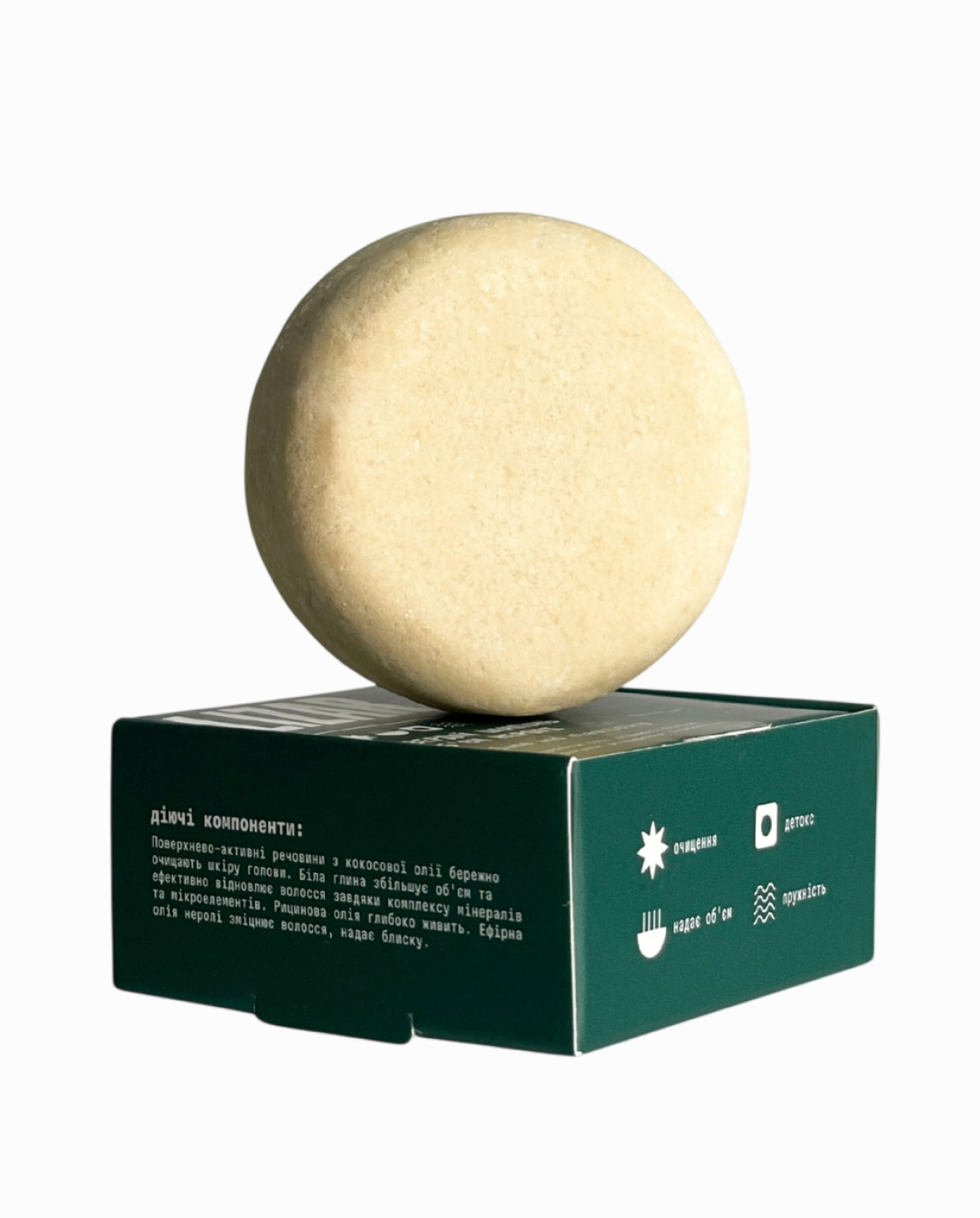 Цей твердий шампунь – знахідка для волосся, якому бракує об’єму. Завдяки білій глині він глибоко очищає шкіру голови від накопиченого стайлінгу та себуму, повертаючи завиткам легкість та природну пишність.